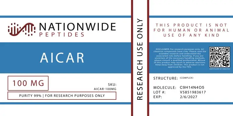 AICAR (Acadesine, AICA-riboside) is an adenosine analog that enters cells and is phosphorylated to ZMP, mimicking AMP and directly activating AMPK — the master metabolic sensor. First studied in the 1990s for cardiac ischemia research, AICAR has become the gold-standard pharmacological tool for AMPK pathway investigation. Currently under clinical investigation for B-cell chronic lymphocytic leukemia (under orphan designation), it remains a widely used reference compound in metabolic and oncology research. This research-grade lyophilized powder is synthesized under strict quality controls and provided with full analytical documentation. For laboratory research use only.
