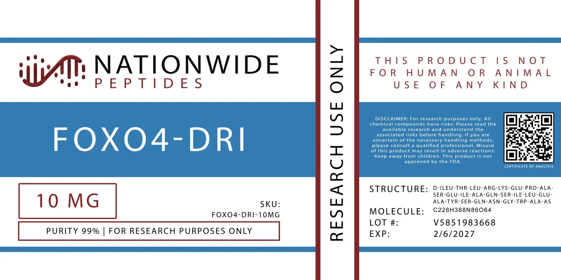 FOXO4-DRI 10 mg vial from Nationwide Peptides — blue-capped reference material peptide product photo