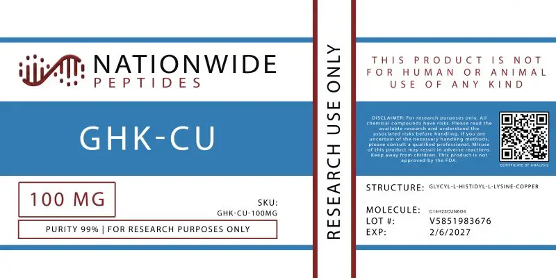 GHK-Cu is a naturally occurring copper-binding tripeptide (Gly-His-Lys) first isolated from human plasma in 1973. When complexed with copper(II) at a 1:1 ratio, it exhibits regenerative and protective effects in preclinical models, making it one of the most widely studied peptides in skin biology, wound healing, and tissue-remodeling research. According to pmc.ncbi.nlm.nih.gov, GHK-Cu stimulates blood vessel and nerve outgrowth, increases collagen, elastin, and glycosaminoglycan synthesis, and supports antioxidant responses in preclinical settings. As noted by nationwidepeptides.com, GHK-Cu has no FDA-approved indications and is investigational only. This research-grade lyophilized formulation is synthesized under strict quality controls and provided with full analytical documentation.