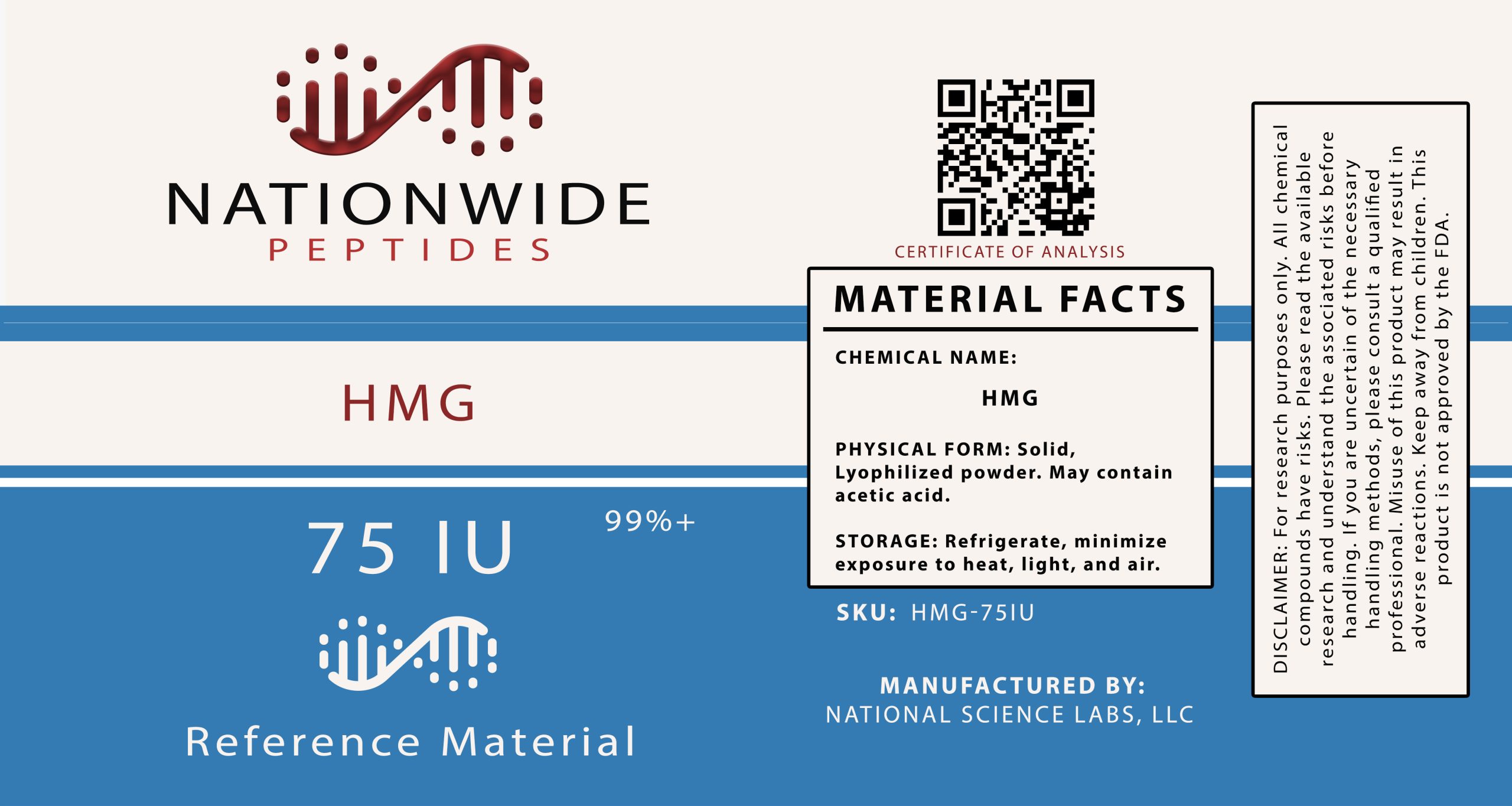 HMG is a purified preparation of human menopausal gonadotropin extracted from postmenopausal women’s urine or produced recombinantly. It provides balanced follicle-stimulating hormone (FSH) and luteinizing hormone (LH) activity in an approximately 1:1 ratio, making it the classic agent for superovulation protocols and fertility research. Originally introduced in the 1960s (Pergonal®), it remains the benchmark for combined FSH + LH stimulation studies. This research-grade lyophilized powder is produced under strict pharmaceutical standards and provided with full analytical documentation.