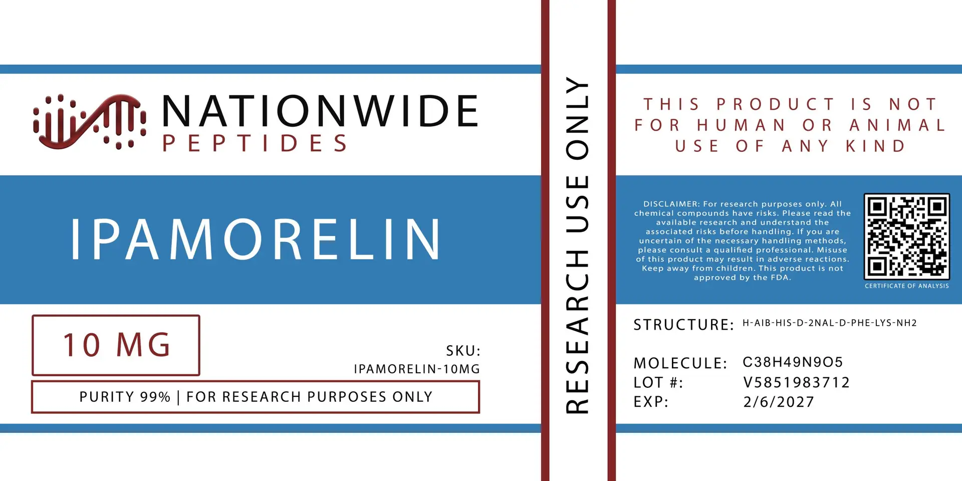 Ipamorelin (Aib-His-D-2-Nal-D-Phe-Lys-NH₂) is a highly selective, synthetic ghrelin mimetic and one of the cleanest growth hormone-releasing peptides available for laboratory research. For Research Use Only. Not for human use.