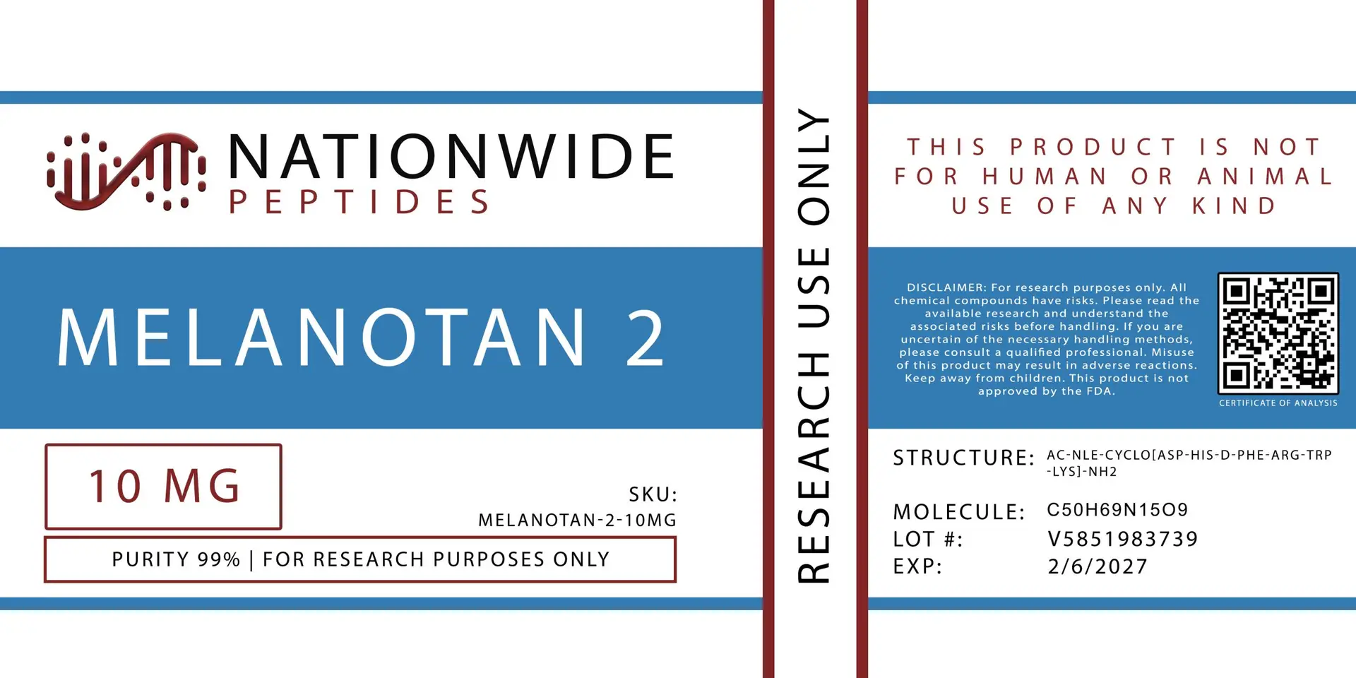 Melanotan 2 (MT-2) is a synthetic melanocortin receptor agonist frequently utilized in laboratory settings to study pigmentation pathways, melanocyte signaling, and UV-response models. This research-grade peptide is synthesized under strict quality controls and provided as a lyophilized powder to ensure maximum stability, structural integrity, and reproducibility for scientific investigations.