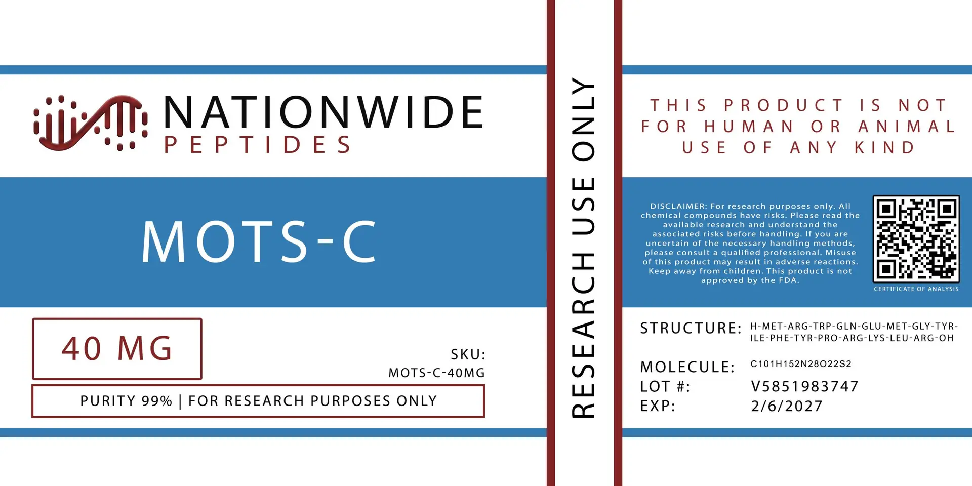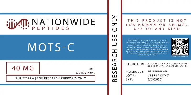 MOTS-c is a mitochondrial-encoded peptide discovered in 2015, encoded within the 12S rRNA region of mtDNA. Under metabolic stress conditions, it translocates to the nucleus to regulate genes involved in energy homeostasis and glucose metabolism. This research-grade lyophilized peptide is synthesized under strict quality controls and provided with full analytical documentation, making it suitable for mitochondrial signaling and metabolic research applications. For Research Use Only. Not for human use.