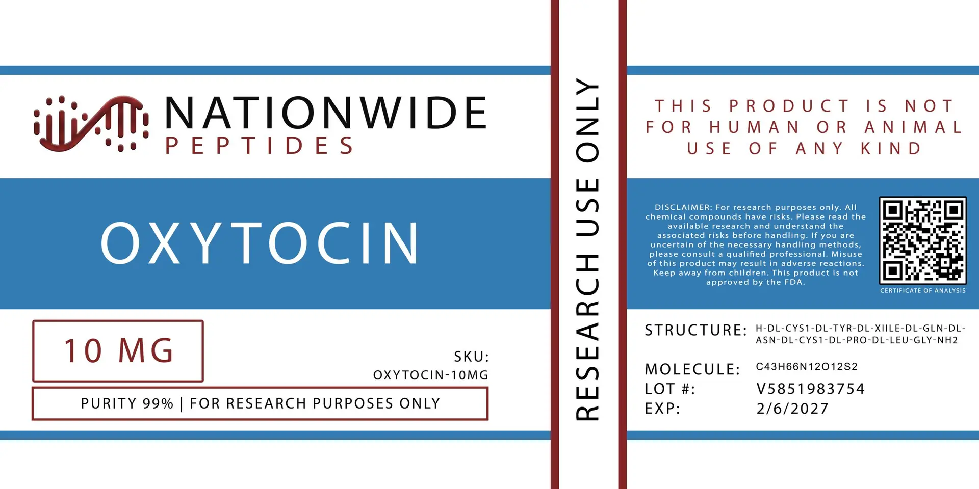 Oxytocin is a synthetic cyclic nonapeptide widely utilized in scientific environments to investigate social behavior, neuroendocrine signaling, receptor activation, and physiological response pathways. Known to interact with the oxytocin receptor (OXTR), this peptide has been extensively studied in non-clinical models of bonding behavior, stress-response signaling, cognitive pathway mechanisms, autonomic responses, and reproductive mechanisms.