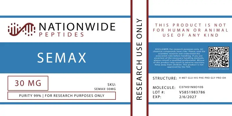 Semax is a synthetic heptapeptide developed at the Institute of Molecular Genetics, Russian Academy of Sciences, in the 1980s. It mimics the N-terminal fragment of adrenocorticotropic hormone (ACTH 4-10) but lacks hormonal activity. It has been studied in scientific literature for its interactions with BDNF synthesis, serotonin/dopamine systems, and gene expression related to vascular and immune pathways. This research-grade lyophilized powder is synthesized under strict quality controls and provided with full analytical documentation. For Research Use Only. Not for human use.