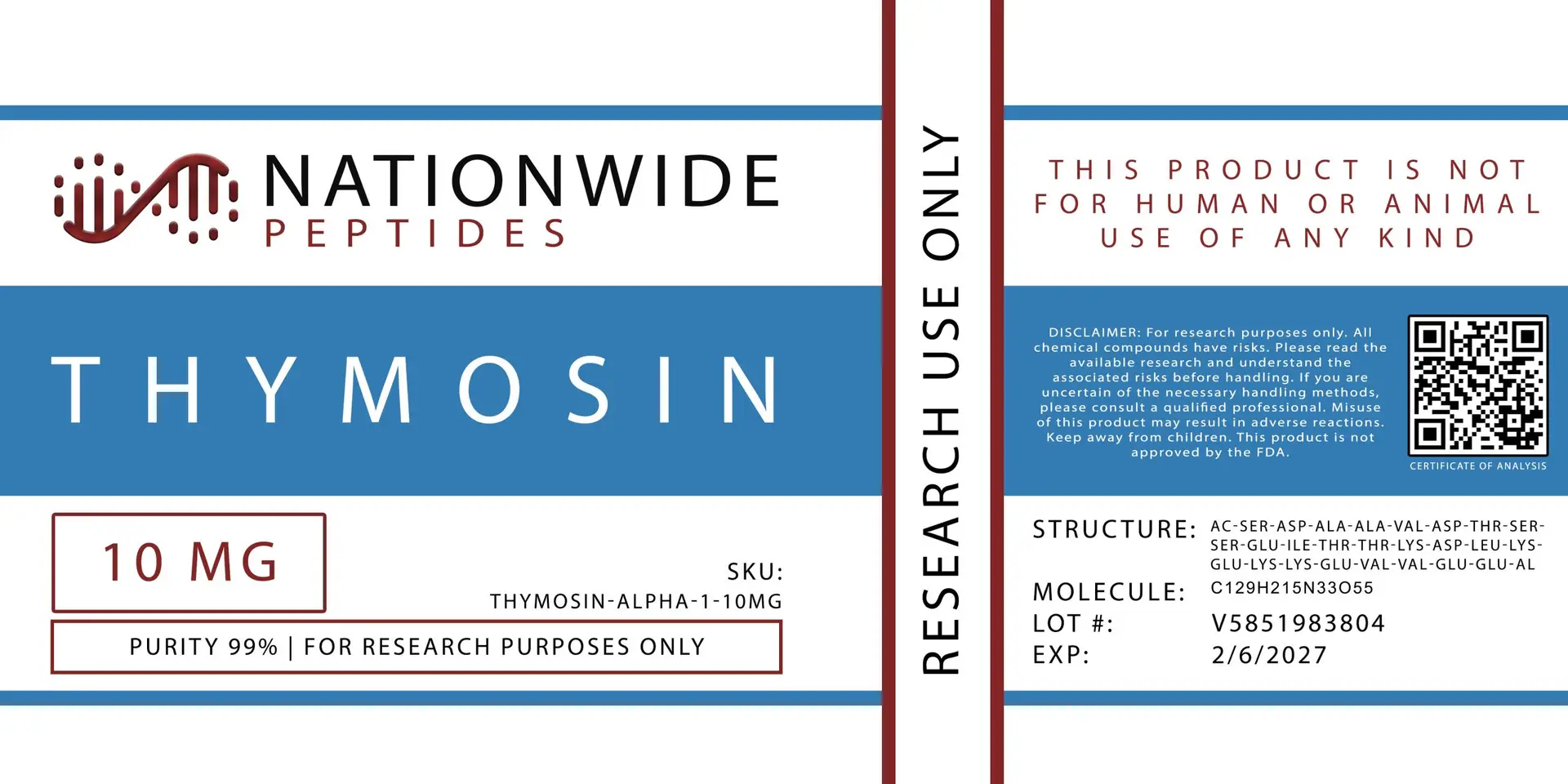 Thymosin Alpha-1 is the N-terminally acetylated, fully synthetic version of prothymosin α fragment 1–28 originally isolated from thymosin fraction 5 (TF5). For Research Use Only. Not for human use. This research-grade lyophilized peptide is produced under strict quality controls and provided with full analytical documentation, making it a reference compound for immunology, virology, and oncology research. According to published scientific literature, Thymosin Alpha-1 (thymalfasin) has been studied extensively as an immunomodulatory peptide; it has received regulatory approval in over 35 countries and has been granted FDA orphan drug designation for hepatocellular carcinoma and stage IV melanoma (fda.gov). It remains unapproved by the FDA and EMA for general therapeutic use in the United States and the European Union.